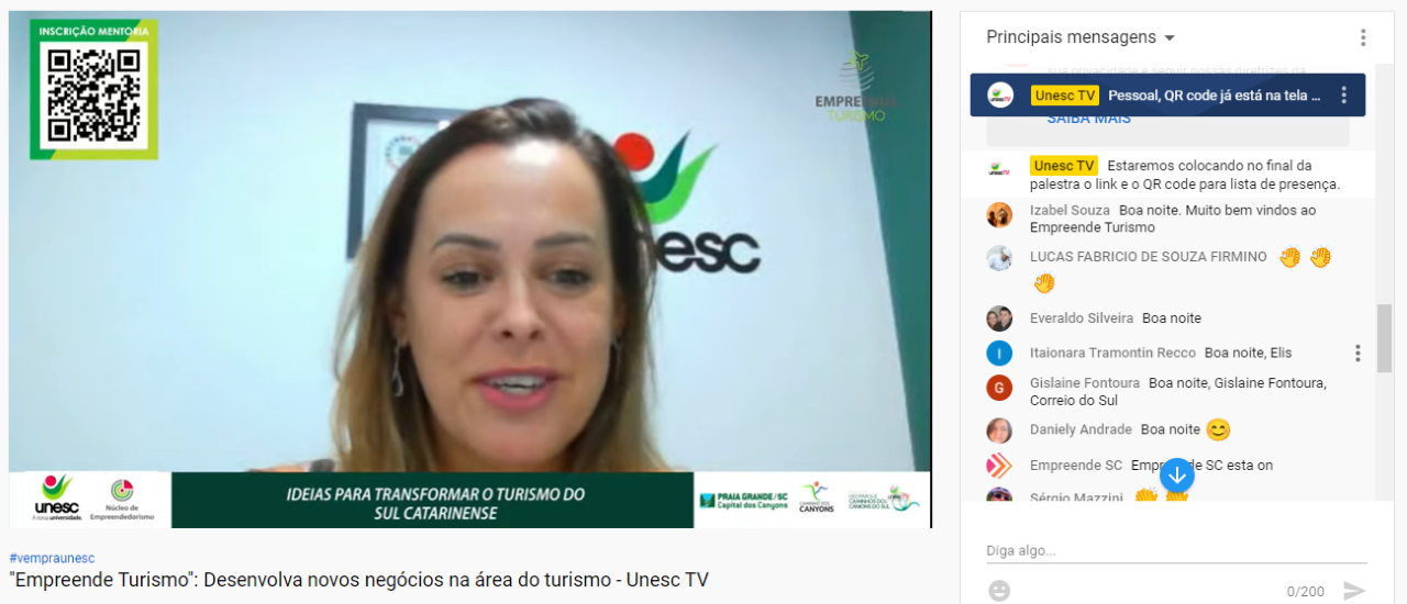O coordenador do Núcleo de Empreendedorismo da Unesc Araranguá, Diogo Morais, foi o responsável por detalhar aos espectadores as fases do projeto e as formas de participar. Conforme o coordenador, todos que tiverem uma ideia relacionada ao turismo e estiverem interessados em investir nela devem aproveitar a oportunidade de fazer isso em parceria com a Universidade. “É uma chance muito especial. O investimento para participar é só um: o tempo de vocês. Só precisa dedicar esse bem tão precioso e que faz toda a diferença para o sucesso do seu negócio”, destacou.