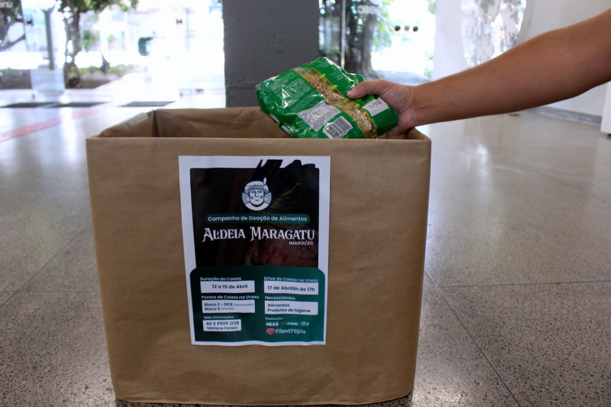 Vamos exercitar a solidariedade? Até o dia 19 de abril, você poderá doar alimentos não perecíveis e produtos de higiene para a aldeia Marãgatu, de Imaruí. A comunidade Mbya-guarani, que preserva as tradições indígenas no Sul do Estado, enfrenta momentos difíceis para alimentar aproximadamente 300 pessoas. Para colaborar para a melhoria este cenário, o Diretório Central dos Estudantes (DCE) e o Núcleo de Estudos Étnico-raciais, Afro-brasileiros, Indígenas e de Minorias (Neab) da Unesc, organizaram uma campanha com pontos de coleta na sede do DCE (Bloco Z), no hall do Bloco Administrativo e na entrada do Bloco S. Haverá ainda um drive-thru para a entrega dos donativos, no sábado (17/4), das 9 às 17 horas, na Universidade.