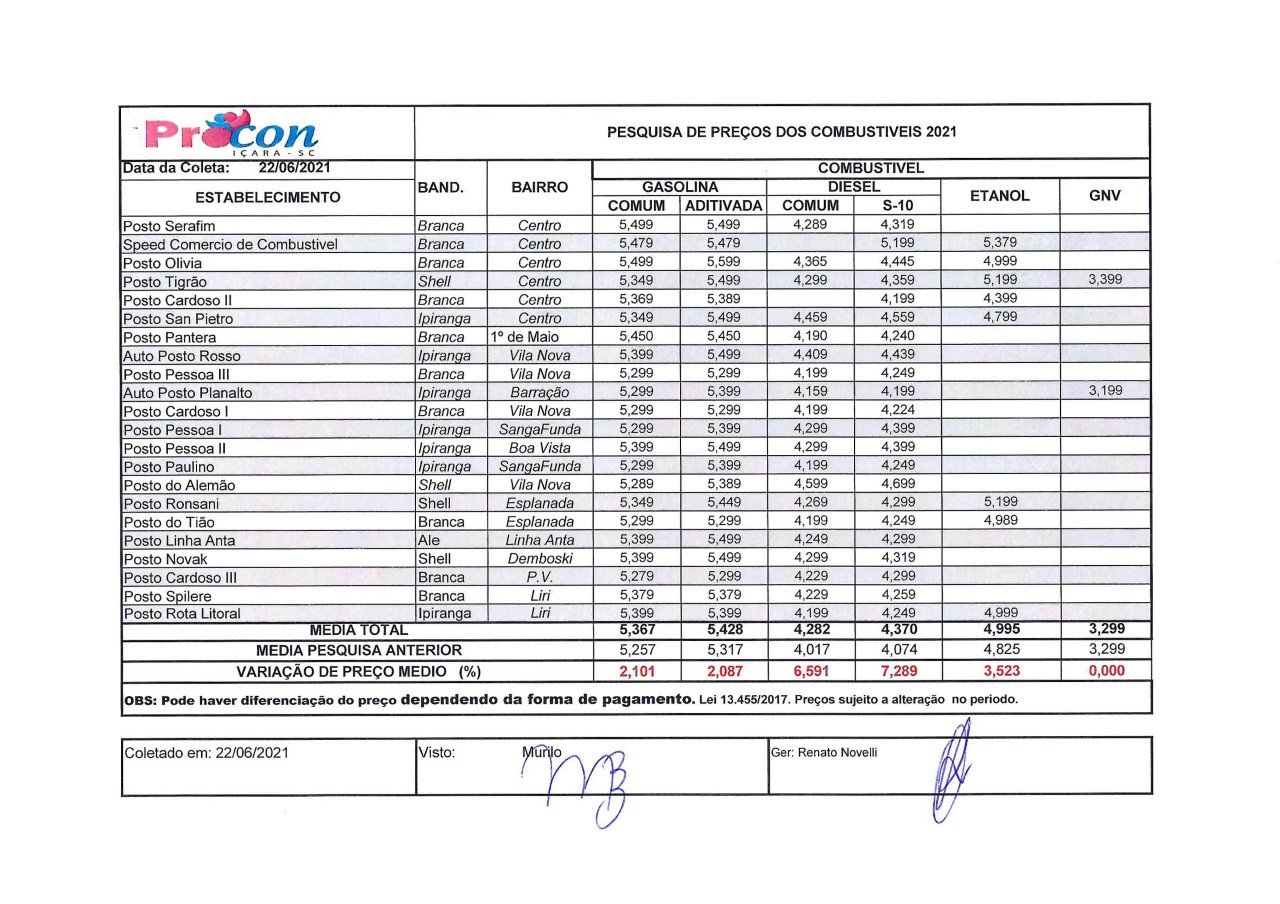 O Procon de Içara realizou nova pesquisa de preço de combustíveis na última terça-feira, dia 22. Se considerarmos todos os itens, o aumento médio foi de 4,26% em comparação com a pesquisa anterior realizada no último dia 27 de abril. A gasolina comum considerada o gênero mais consumido teve um aumento de 2,1%. Ainda nesse item, a variação entre o maior e o menor valores foi de R$ 0,22 centavos, com o mais barato (R$ 5,27) verificado em um estabelecimento do bairro Presidente Vargas e o mais caro (R$ 5,49) no Centro.