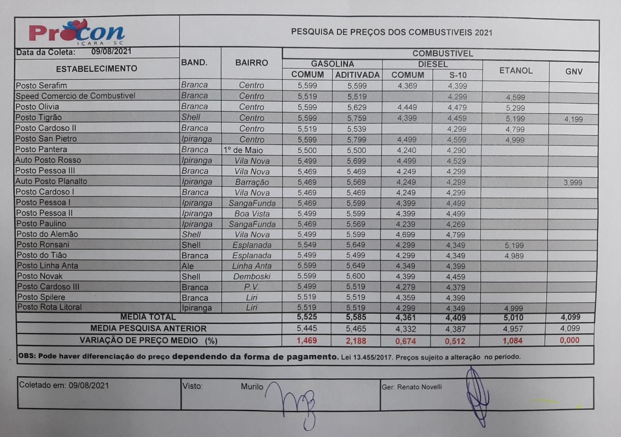 O preço médio dos combustíveis sofreu um acréscimo médio de 0,9% quando comparado com a pesquisa realizada em 8 de julho. Essa média considera os combustíveis gasolina comum e aditivada, diesel comum e S-10, etanol e GNV. "O Procon está empenhado em fornecer informações ao consumidor para que ele tenha segurança na hora de consumir produtos e serviços em Içara", comentou o coordenador do órgão Renato Noveli. No quadro abaixo, você confere o valor médio dos itens entre as pesquisas de julho e agosto, além do percentual de reajuste: